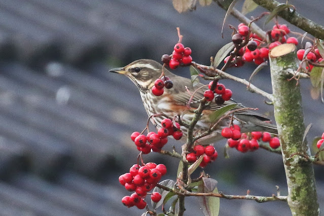 Weather wise the end of the year and into the new year has seen the coldest weather of the winter so far. Any period of cold weather, I watch the berries on the tree across the road from me. The big hope of course is for Waxwings, but that is not going to happen this year and remains a distant hope every year. No, every year the Redwings will come to eat the berries it just depend how much other food is available. After a couple of frosts into the new year they arrived.